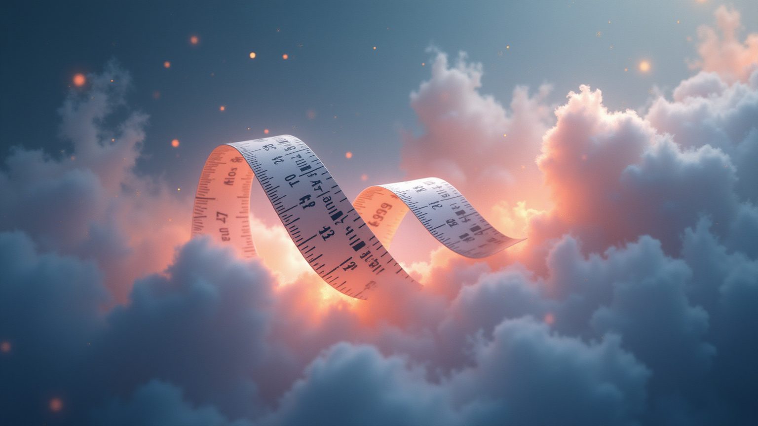 Un metro pieghevole che fluttua nell’aria simboleggia la misura sfuggente dei sogni e dei desideri nascosti.
