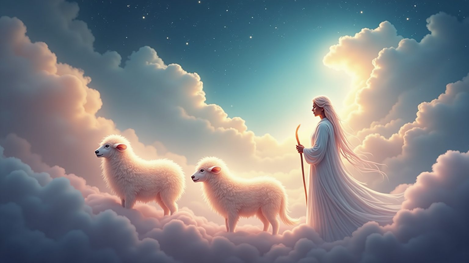 Nei sogni, il pastore di pecore guida l’anima smarrita verso la pace nascosta tra ombre e luci misteriose.