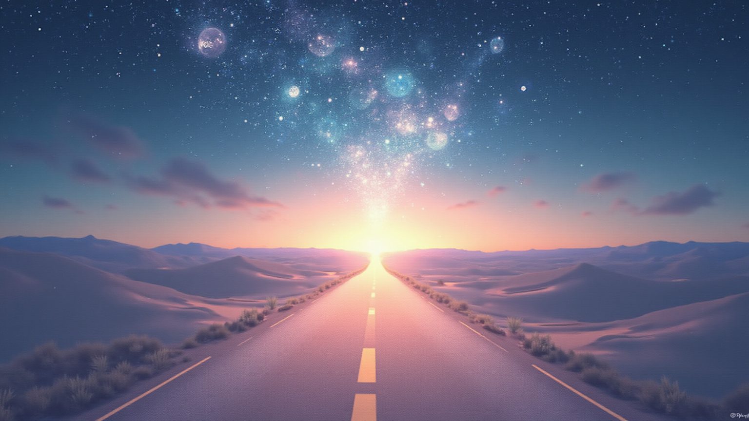 Il cielo stellato sopra la strada desertica simboleggia spesso la guida interiore, la speranza e la promessa di un futuro luminoso, anche in un contesto apparentemente arido e solitario.
